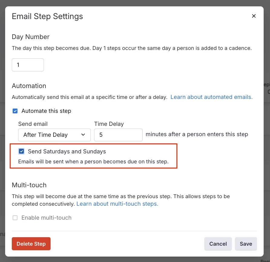 Most Cadence emails don’t send on Saturdays and Sundays since many people are off on the weekends. But, some leads are active outside the typical work week—think inbound leads who fill out a form on a Saturday or contacts with non-standard schedules.
