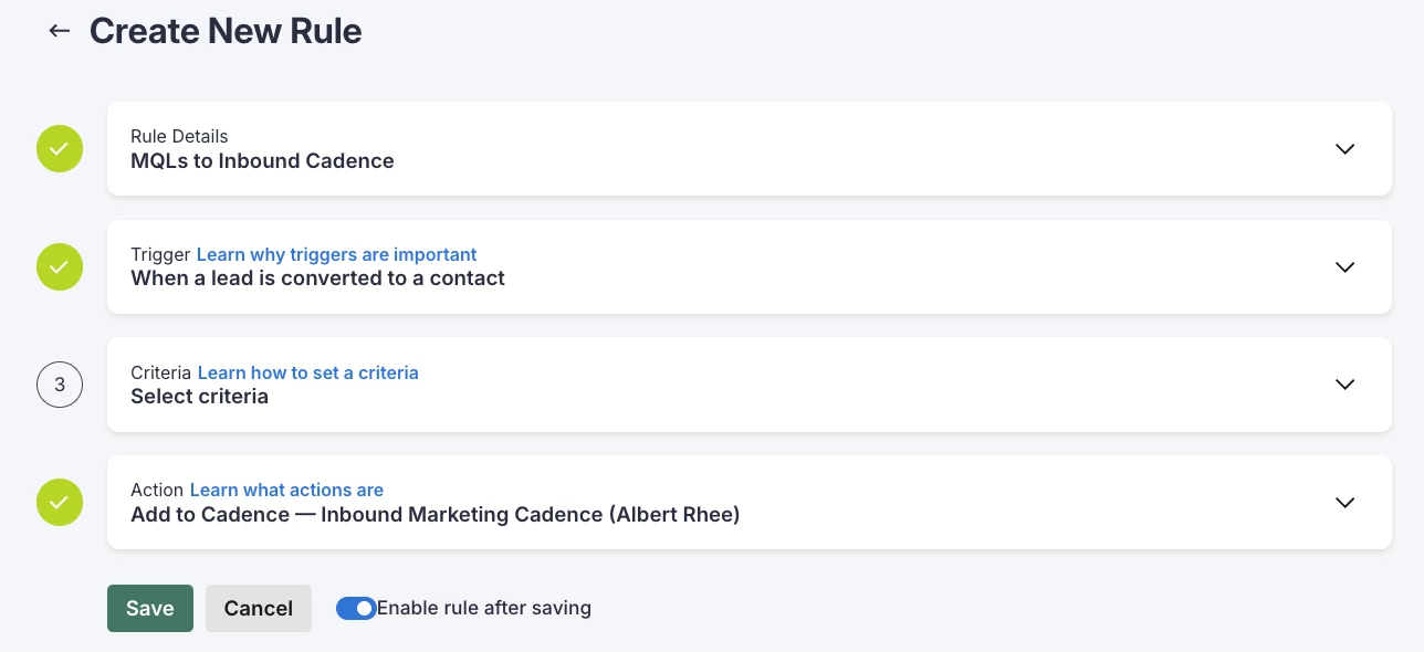To get started, you’ll want to create an Automation Rule to add marketing qualified leads to an Inbound Cadence.