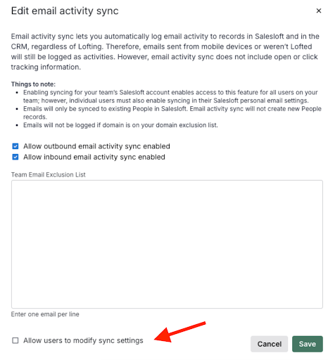 How: Admins can “Allow users to modify sync settings” via the Admin Email Settings > Email activity sync > checkbox for allowing modifications. Utilizing this feature (dis)allows individual users to enable or disable inbound/outbound sync.