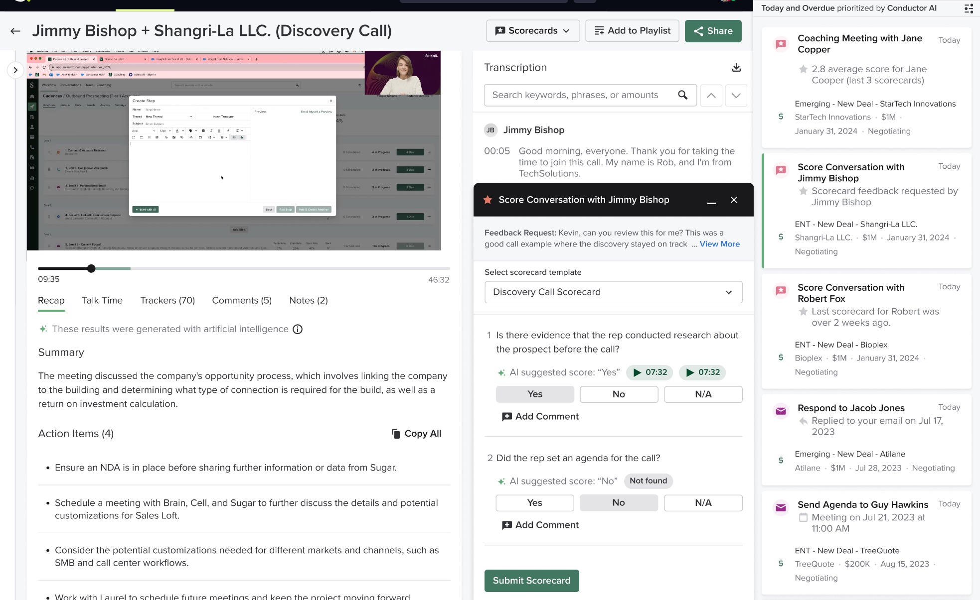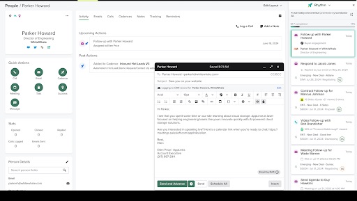 Users can request conversation reviews, which generates an action in Rhythm for the reviewer, helping sales managers to more efficiently coach their reps.