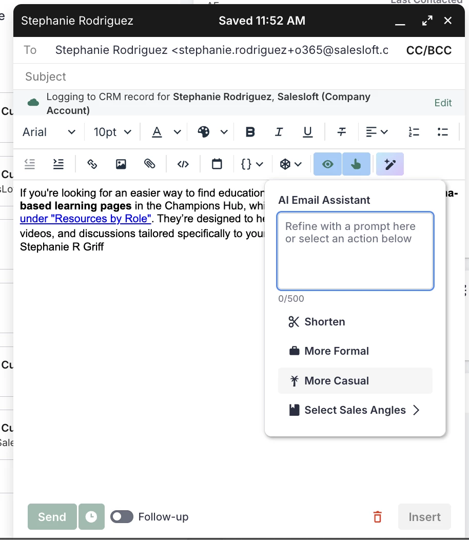 How: Explore the feature by opening a new email composer in Salesloft. To learn more, check out the Generate an Email Draft with the AI Assistant and Refine Emails Using the AI Assistant articles.