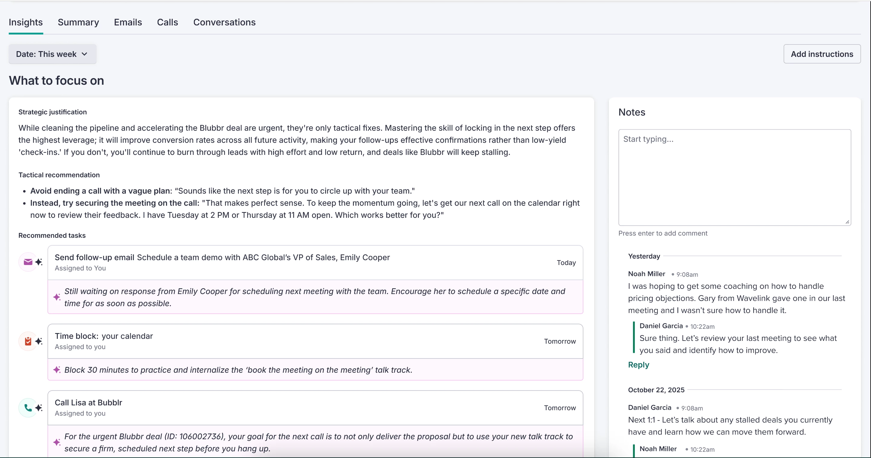 Where: Weekly AI-Generated Summaries are delivered via email and housed in a new dedicated Insights page within Coaching in Salesloft.